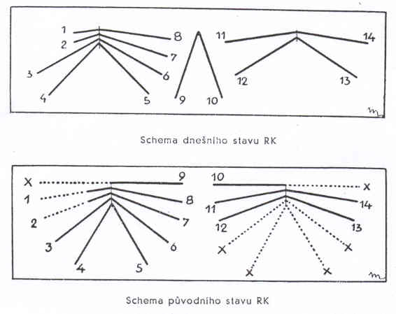 schematické znázornění dnešního stavu RK a rekonstrukci stavu původního, na